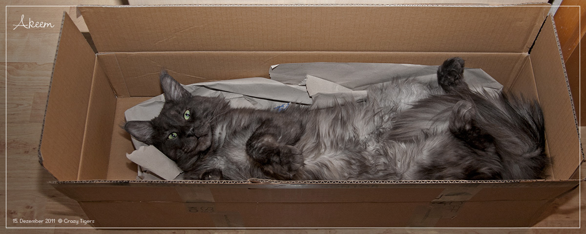 Akeem nutzt diese Schachtel als Entspannungs- und Schlafplatz.