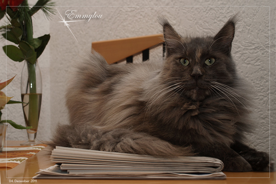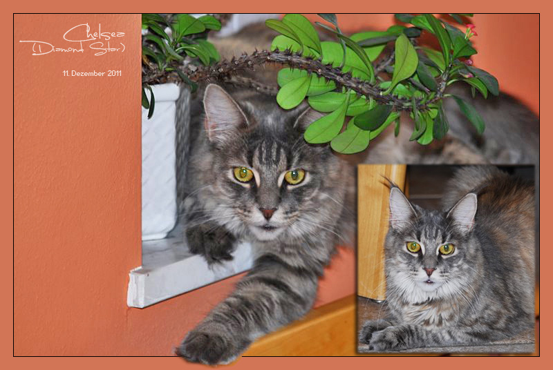 Unsere Kastratin Chloe stellt sich fürs Familienalbum zur Schau. Neue Offspring-Bilder eingetroffen - Chelsea (Diamond Star) grüßt aus München und Dakota Lady schickt Grüsse aus Schönwald (Funky Souls-Maine Coon) . Danke an Daniela und Vera.