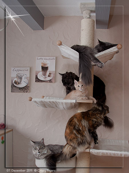 Der Kratzbaum im Eßzimmer ist voll besetzt. Bolero überwacht aufmerksam unsere Katzenbande.