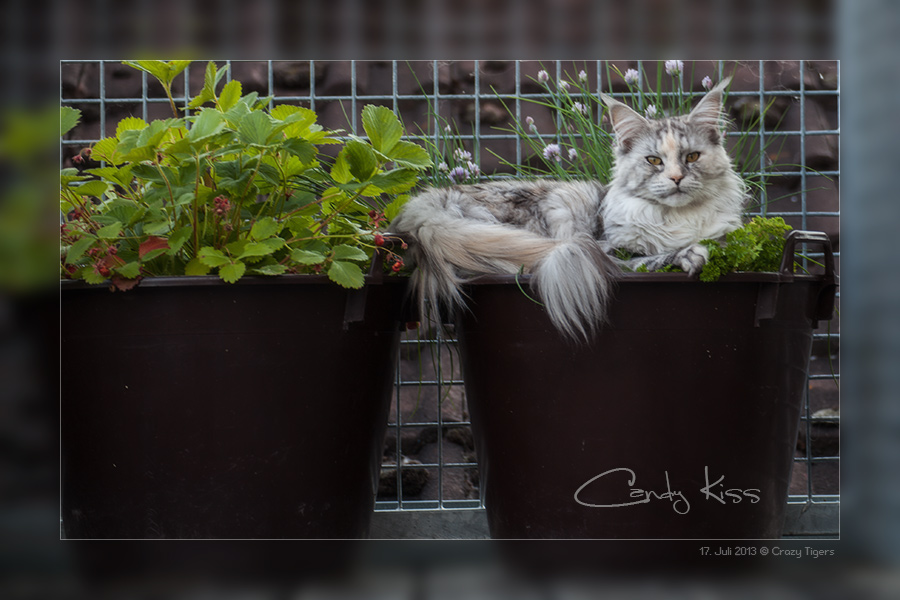 Candy Kiss macht es sich im Küchenkräuter-Topf bequem - Nomia setzt sich für ein Bild in Pose. Auf diesem Bild beobachtet Gaston die Spielereien von Candy mit Nomia.