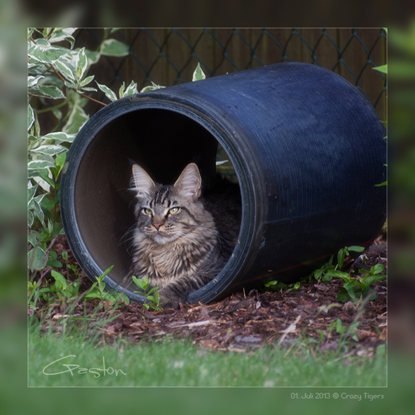 Gaston findet die neuen Verstecke im Garten super - oder man benutzt diese schattigen Röhren für eine kleine Abkühlung.