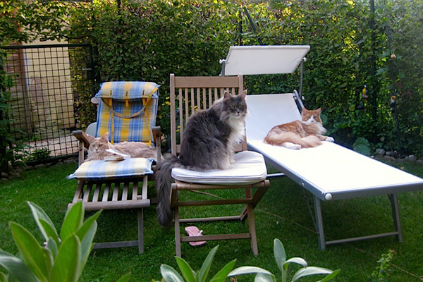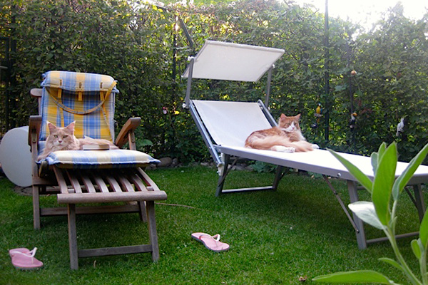 Gaston beobachtet Candy Kiss, wie sie es sich auf dem Gartentisch bequem macht.