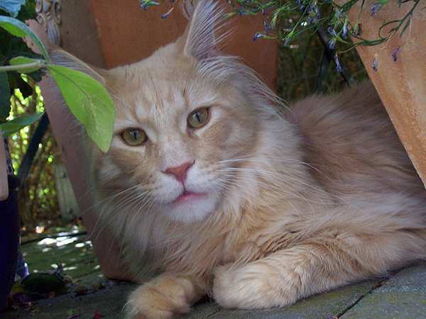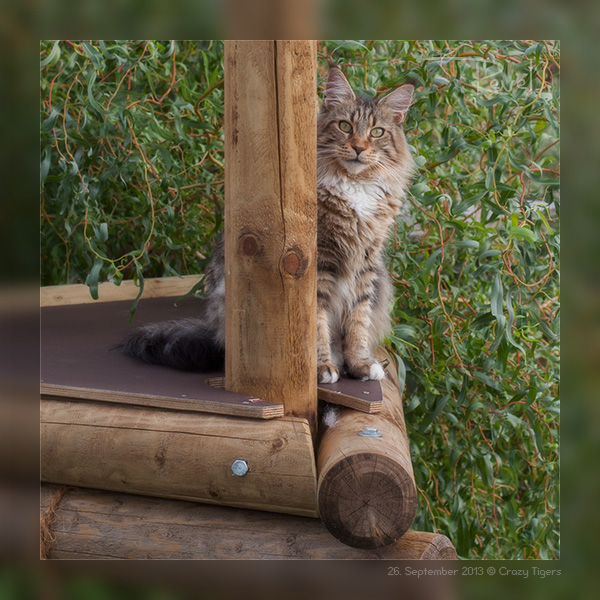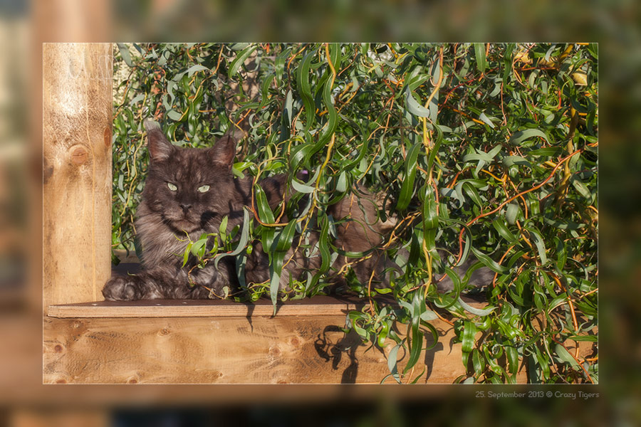 Akeem liegt auf dem Gartenkratzbaum etwas versteckt unter den Weidenzweigen und lässt sich von der Abendsonne wärmen.