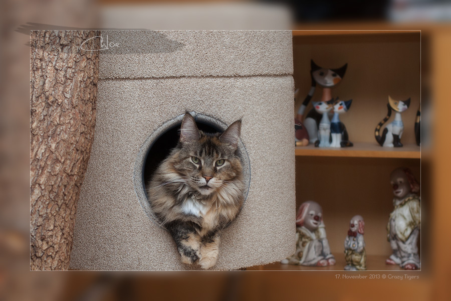 Chloe hat sich in der Kratzbaumhöhle "eingenistet" - von hier aus kann sie das ganze Wohnzimmer überblicken.