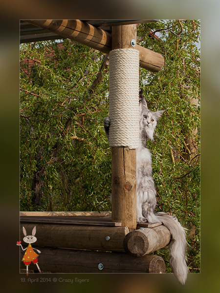 Candy Kiss prüft die neue Sisalwicklung am Gartenkratzbaum.
