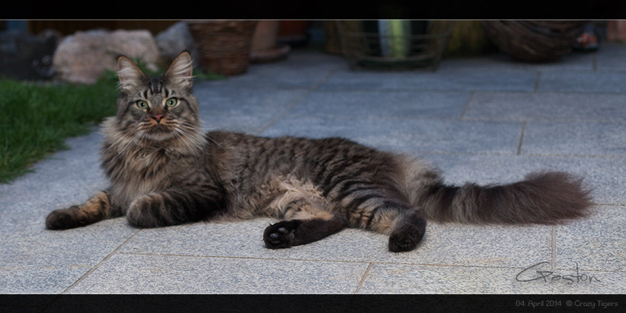 Gaston genießt die sonnenwarmen Granitplatten auf der Terrasse.