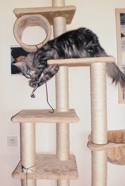 I'Xi liegt ganz entspannt im Schatten vom Gartenkratzbaum.