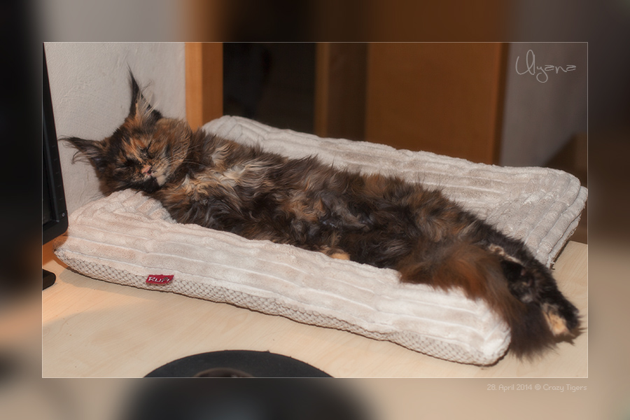 Ulyana liegt sehr relaxed auf dem Rufi-Cordkissen neben dem Computer.