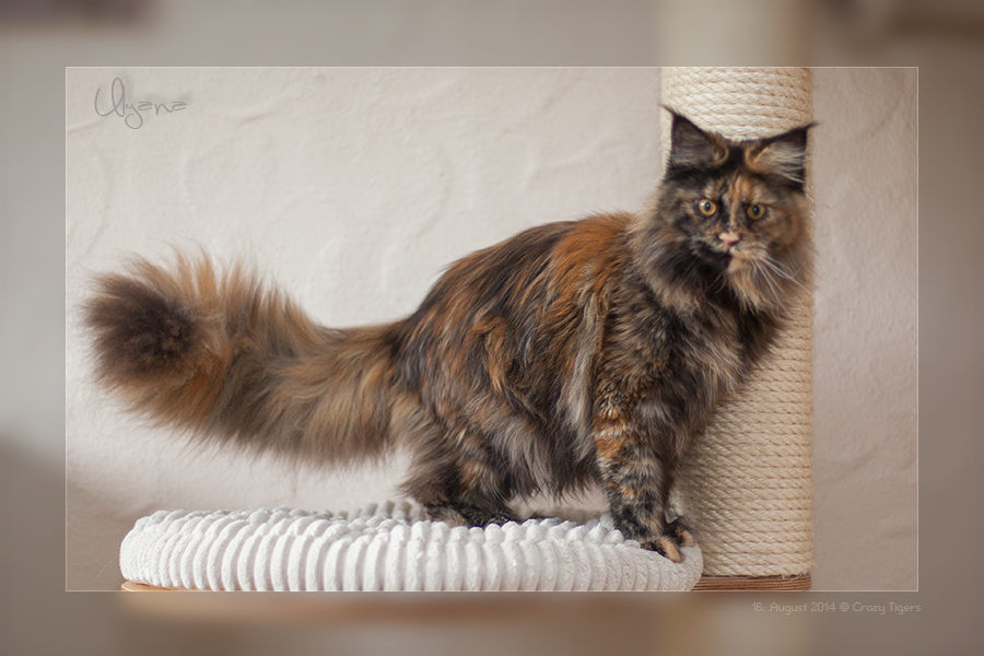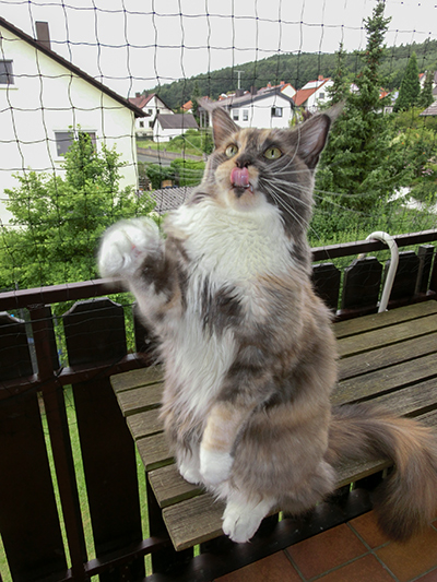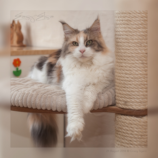 Bei schlechtem Wetter sind die Plätze der Kratzbäume im Haus gefragt - Ulyana turnt auf dem im Esszimmer und Easy-Elsa besetzt den im Wohnzimmer.