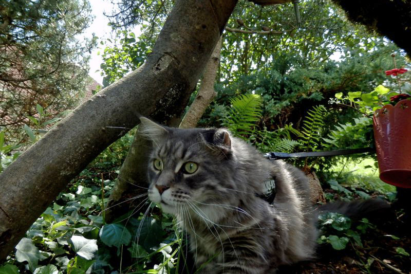 Annette schickt Gartenbilder mit Gonzales - hier streift der Tiger durch's Gebüsch.