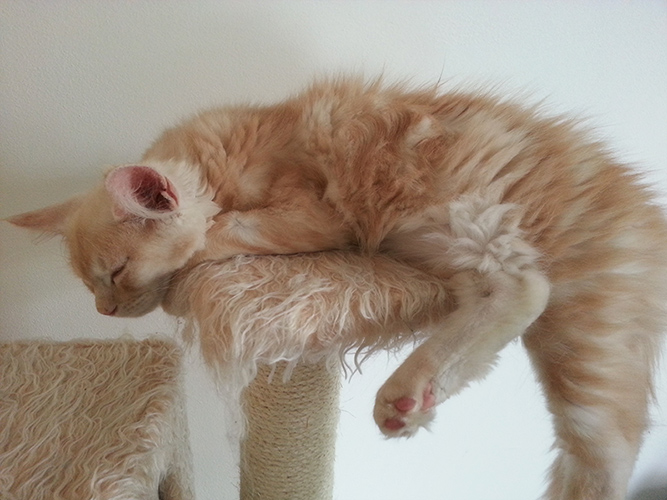 Julia schickt ein erstes Bild von Xalvadore - hier ist er beim Spielen auf dem Kratzbaum eingeschlafen.