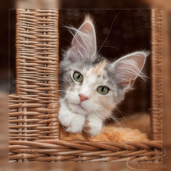 Isabella schaut interessiert aus dem "3. Stockwerk" des Weidenkorbs.