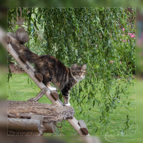 Xantia nimmt den Weg über die Leiter des Außenkratzbaums.