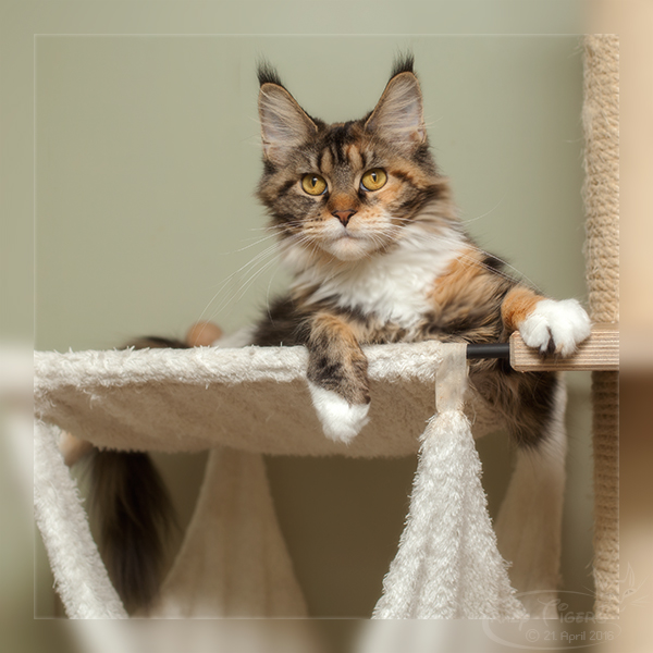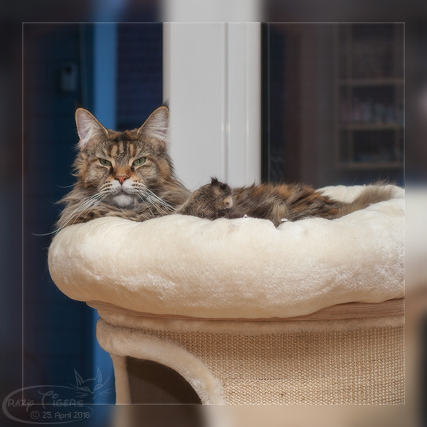 Cover Girl in der Liegeschale des Kratzbaums.
