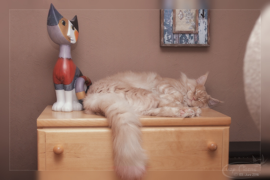 Xtreme hat sein Schlafplätzchen im Wohnzimmer auf das Sideboard verlegt.