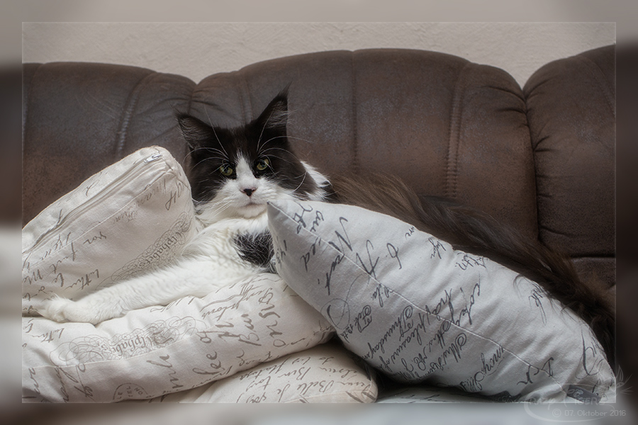 I'Xi macht es sich auf den Couch-Kissen gemütlich.
