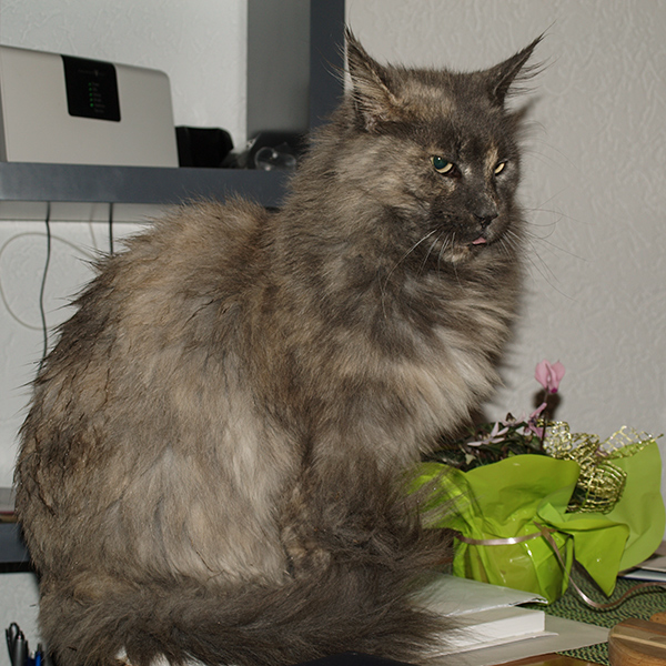 Henri liegt neben dem PC auf dem Schreibtischkissen.