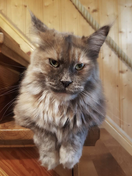 Cecil liegt in der Kratzbaumschale und beansprucht gleichzeitig den kleinen Sitzring mit ihren dicken Pfoten.
