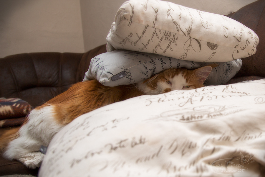 Adriano möchte sich unter dem Kissenstapel verstecken.