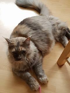 Ricki reckt sich in der Kratzbaumschale.