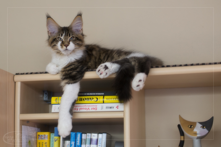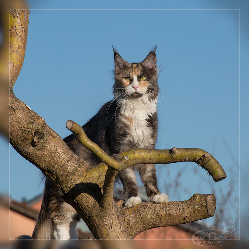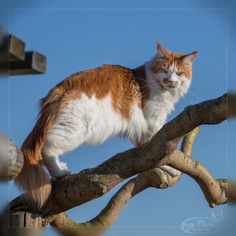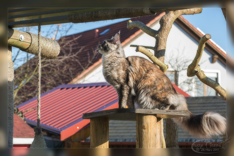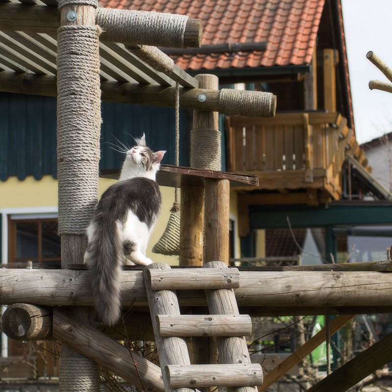 Donna springt auf die Kratzbaum-Pergola.