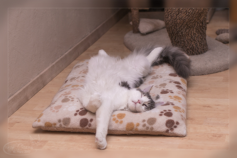 Ricki im Schlafmodus auf dem Raschelkissen.