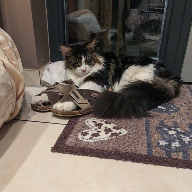 Falco - er versucht eine Runde mit Hausschuhen. Sabine schickt aktuelle Bilder von