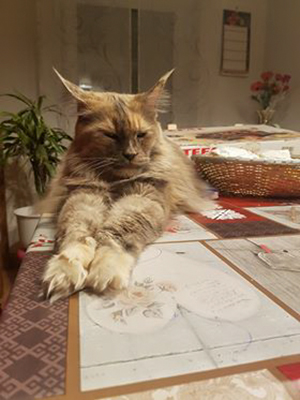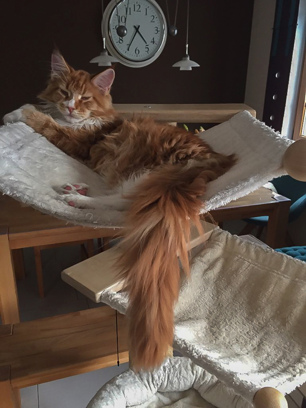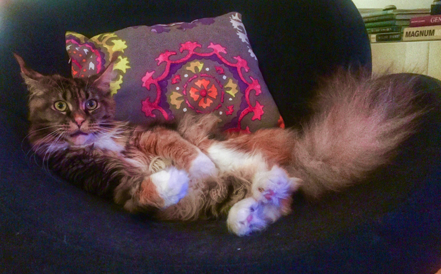 Fabio macht Pause und streckt sich längs auf den Eßzimmertisch.