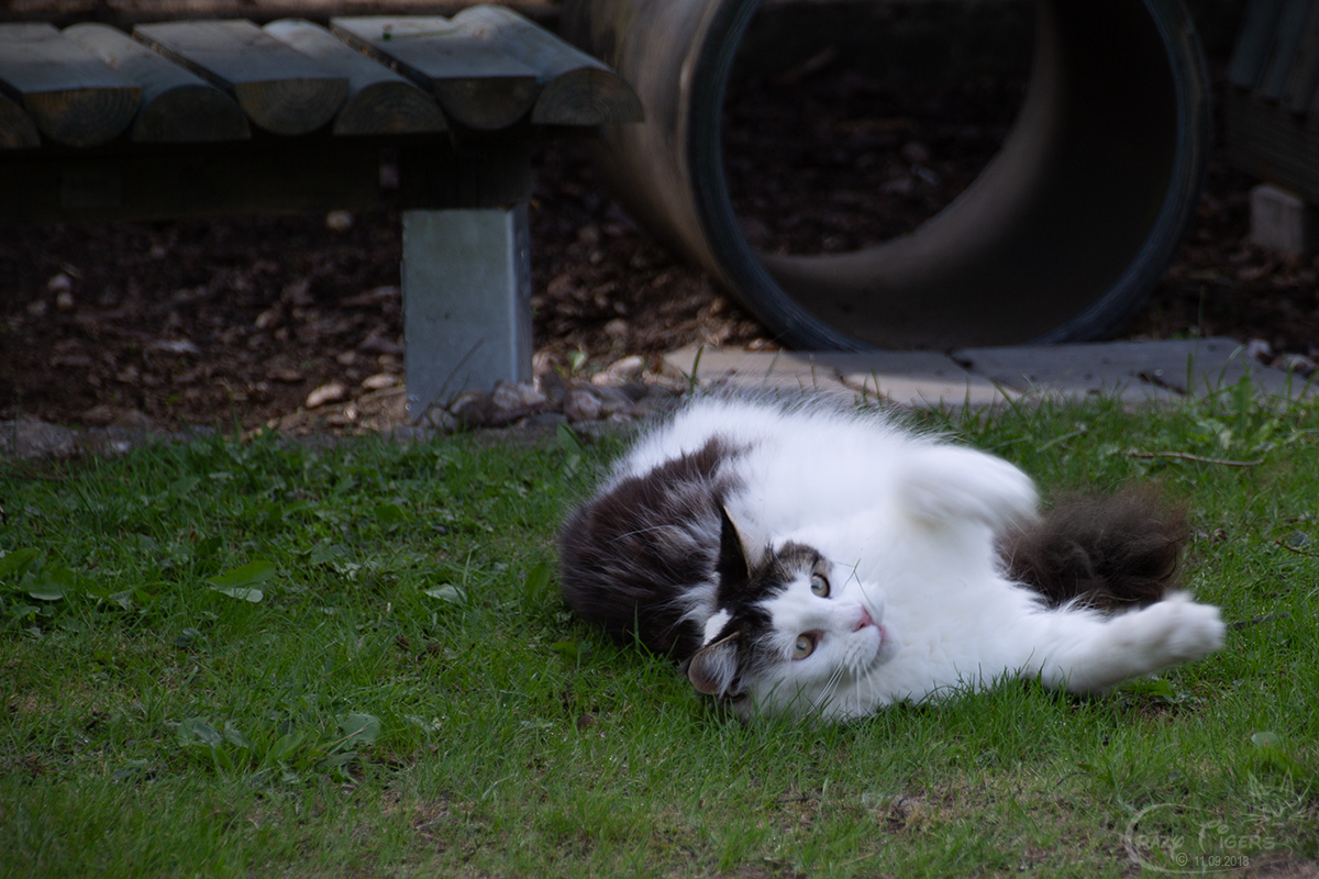 Jamie ist gut aufgelegt und rollt sich im Gras.