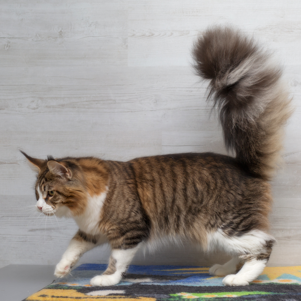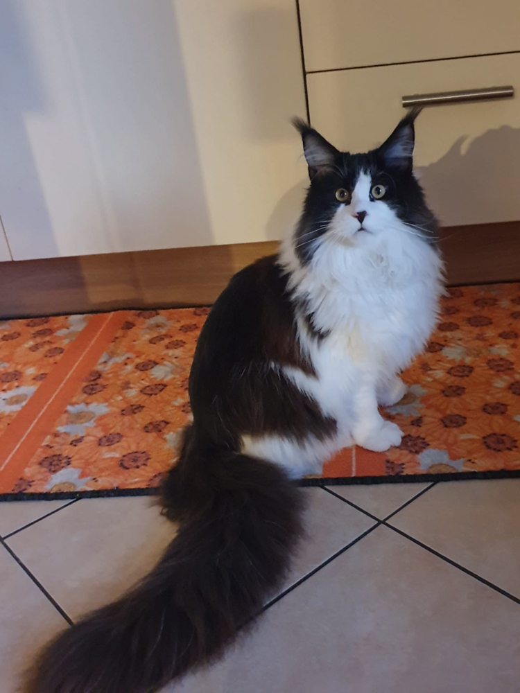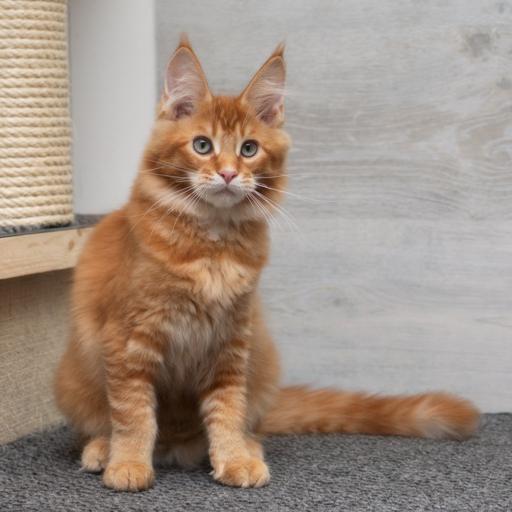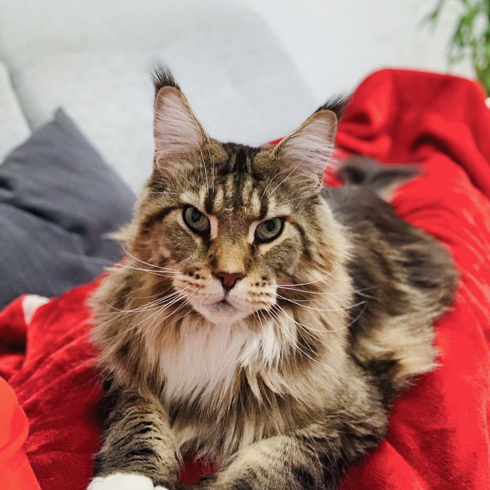 Zorro setzt sich auf dem Kratzbaum in Pose.