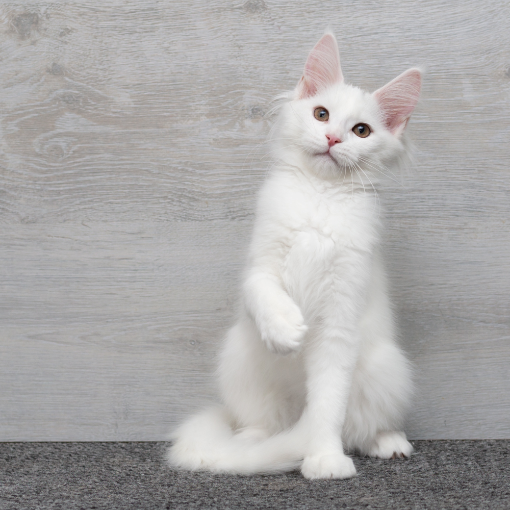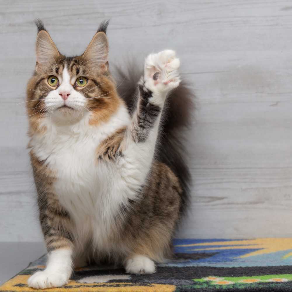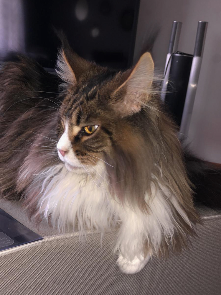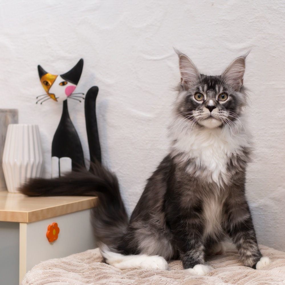 Zorro setzt sich auf dem Kratzbaum in Pose.