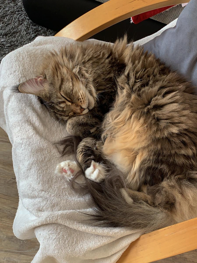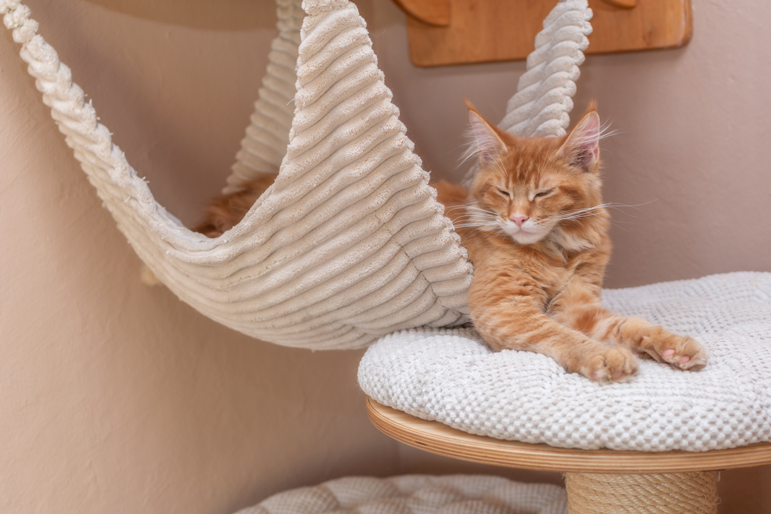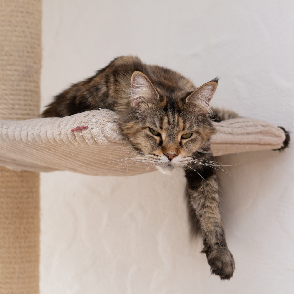 Fabio liegt in der Kratzbaumschale auf dem Rücken und macht ein Nickerchen.