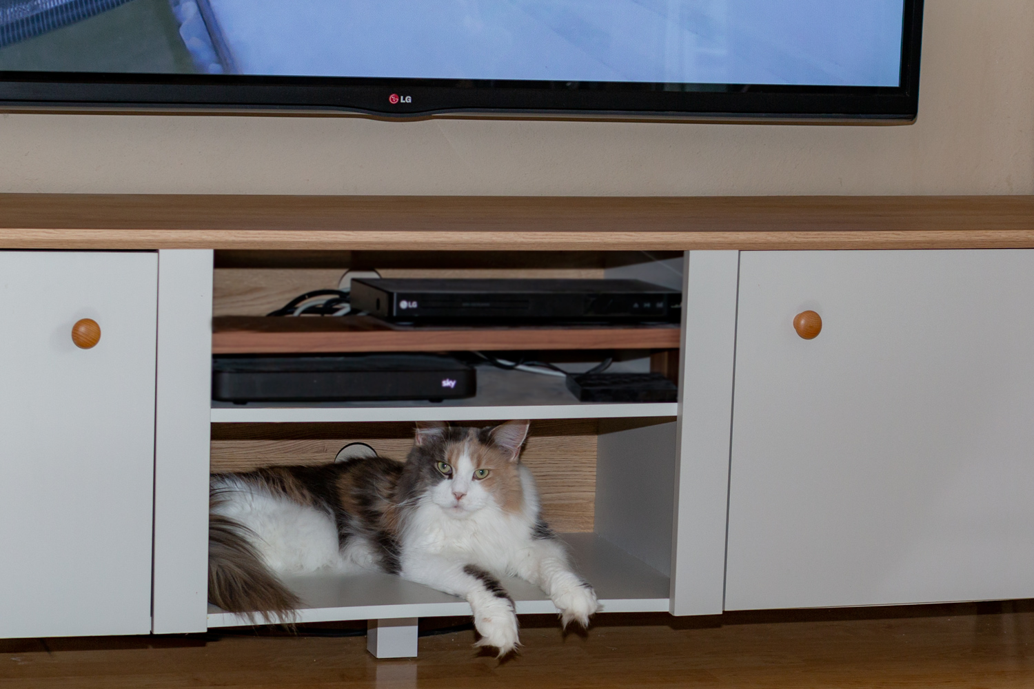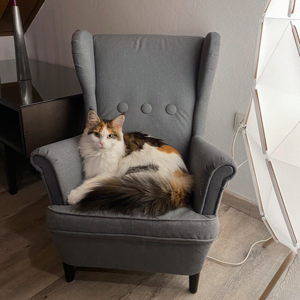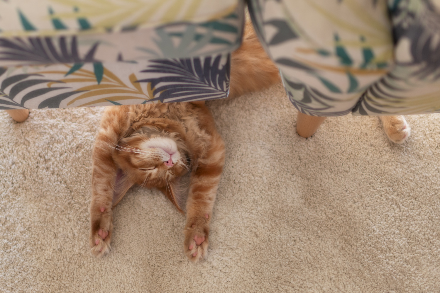 Annabel hat sich unterm Wohnzimmersessel breit gemacht.