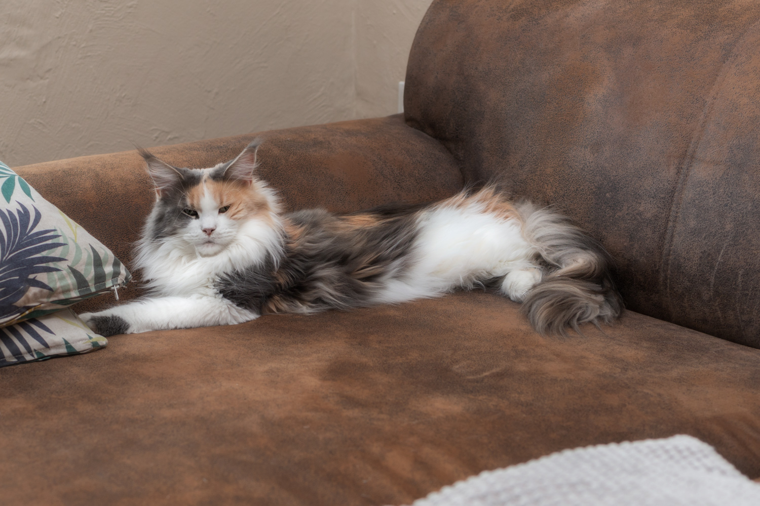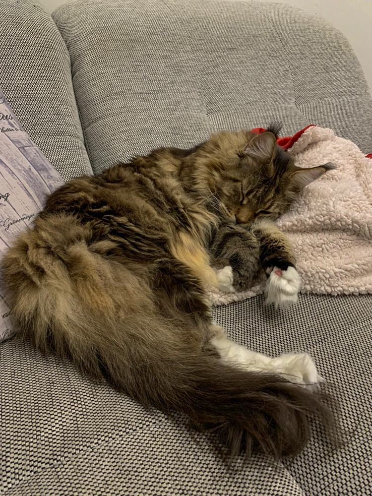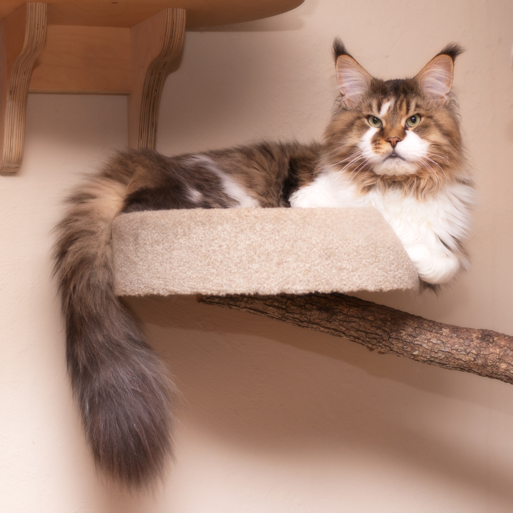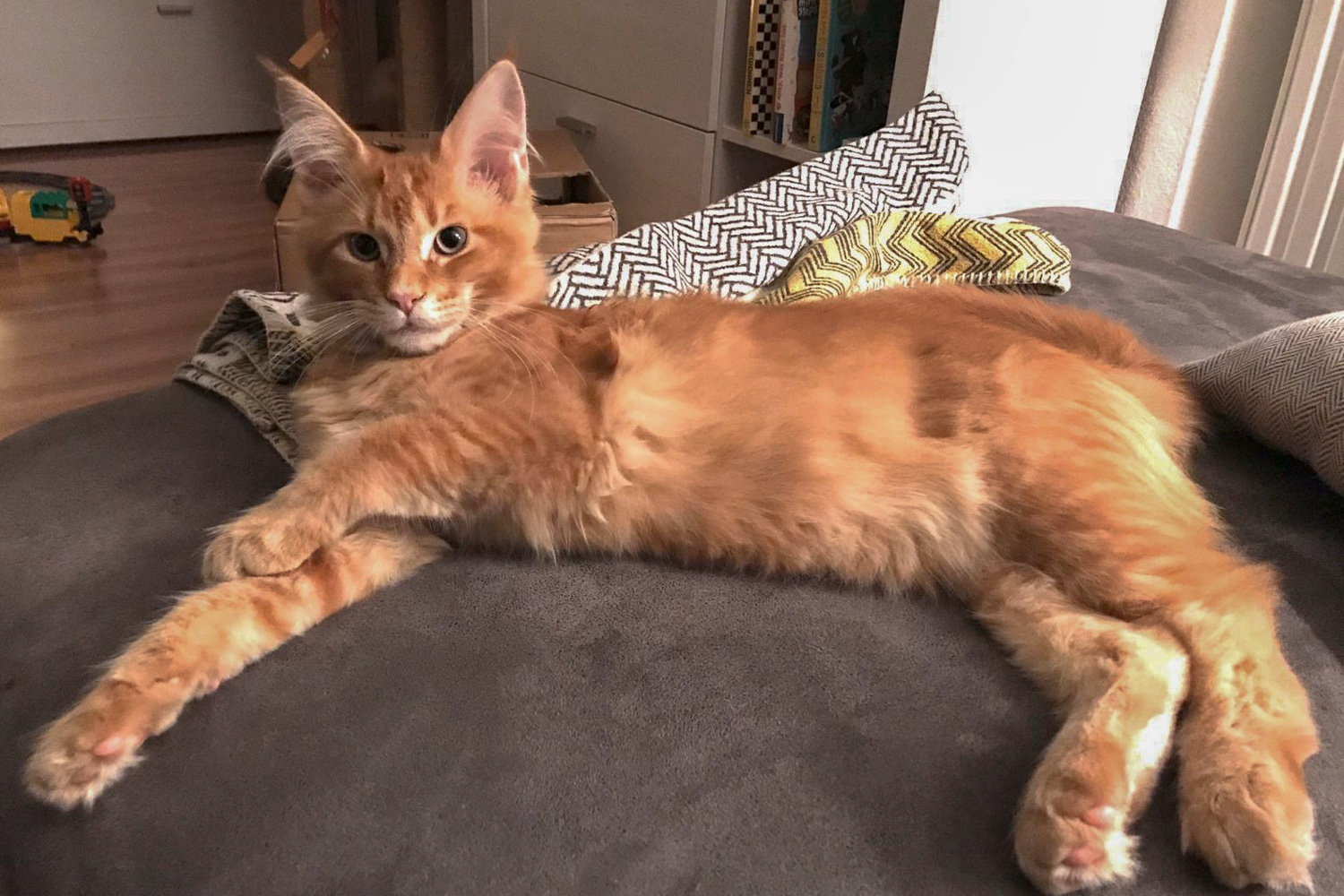 Fabio liegt auf dem Wohnzimmerkratzbaum und füllt den Liegenplatz komplett aus.