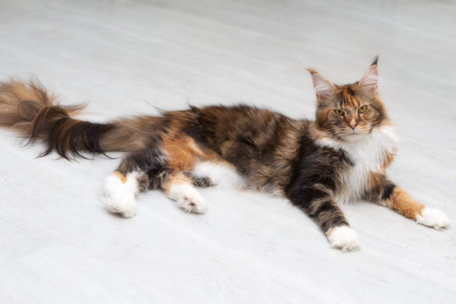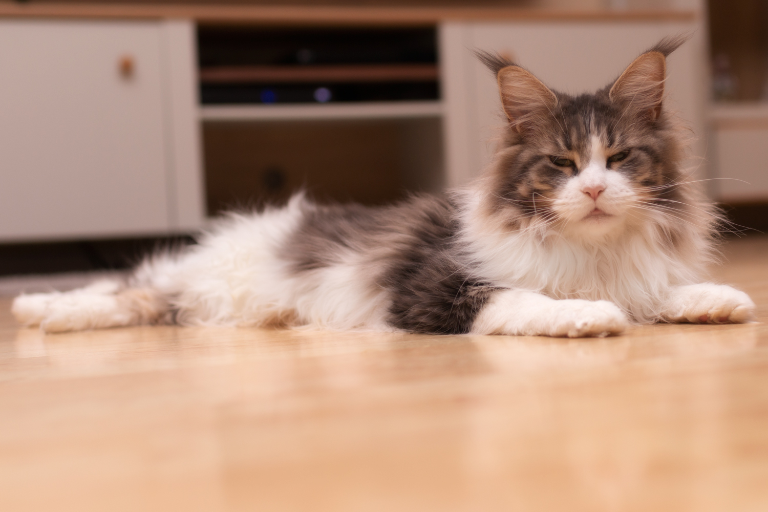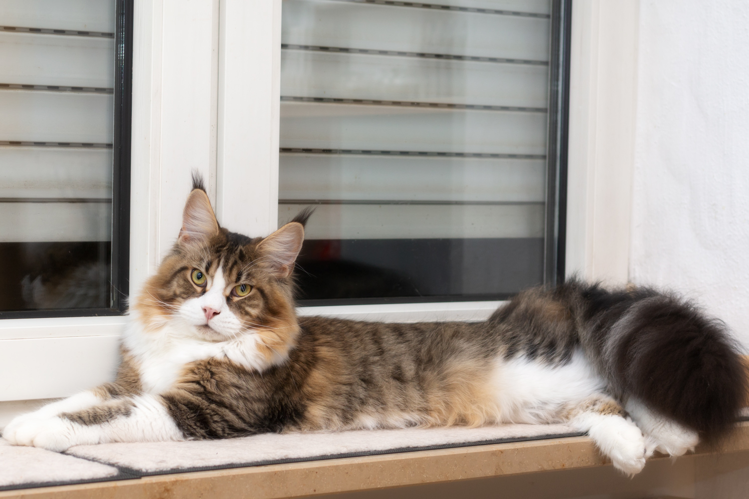 Fabio liegt auf dem Wohnzimmerkratzbaum und füllt den Liegenplatz komplett aus.