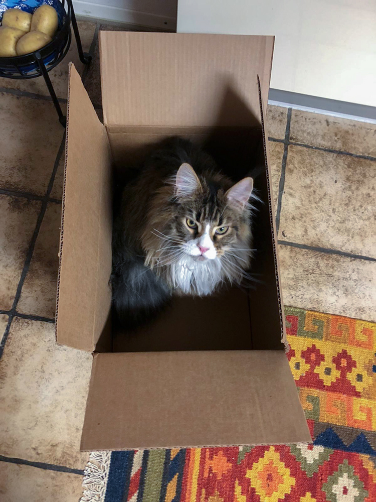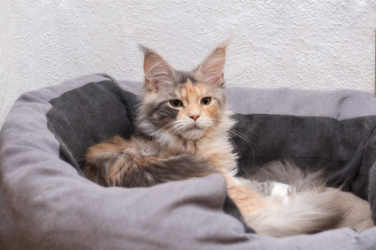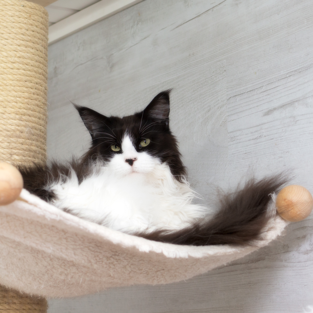 Fabio hat sich mühsam in die Kratzbaumschale gepresst.