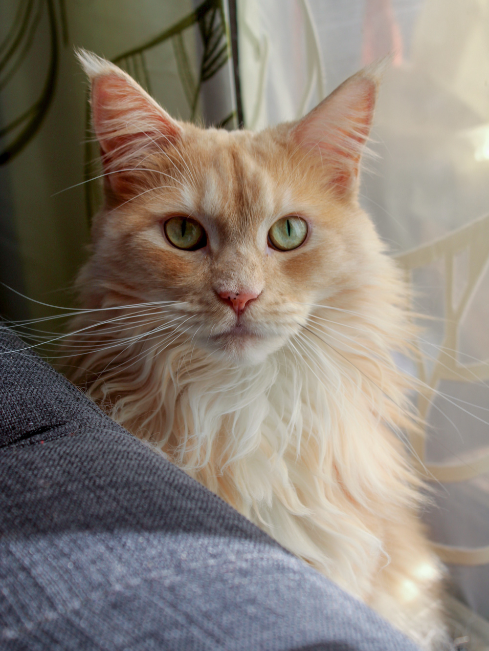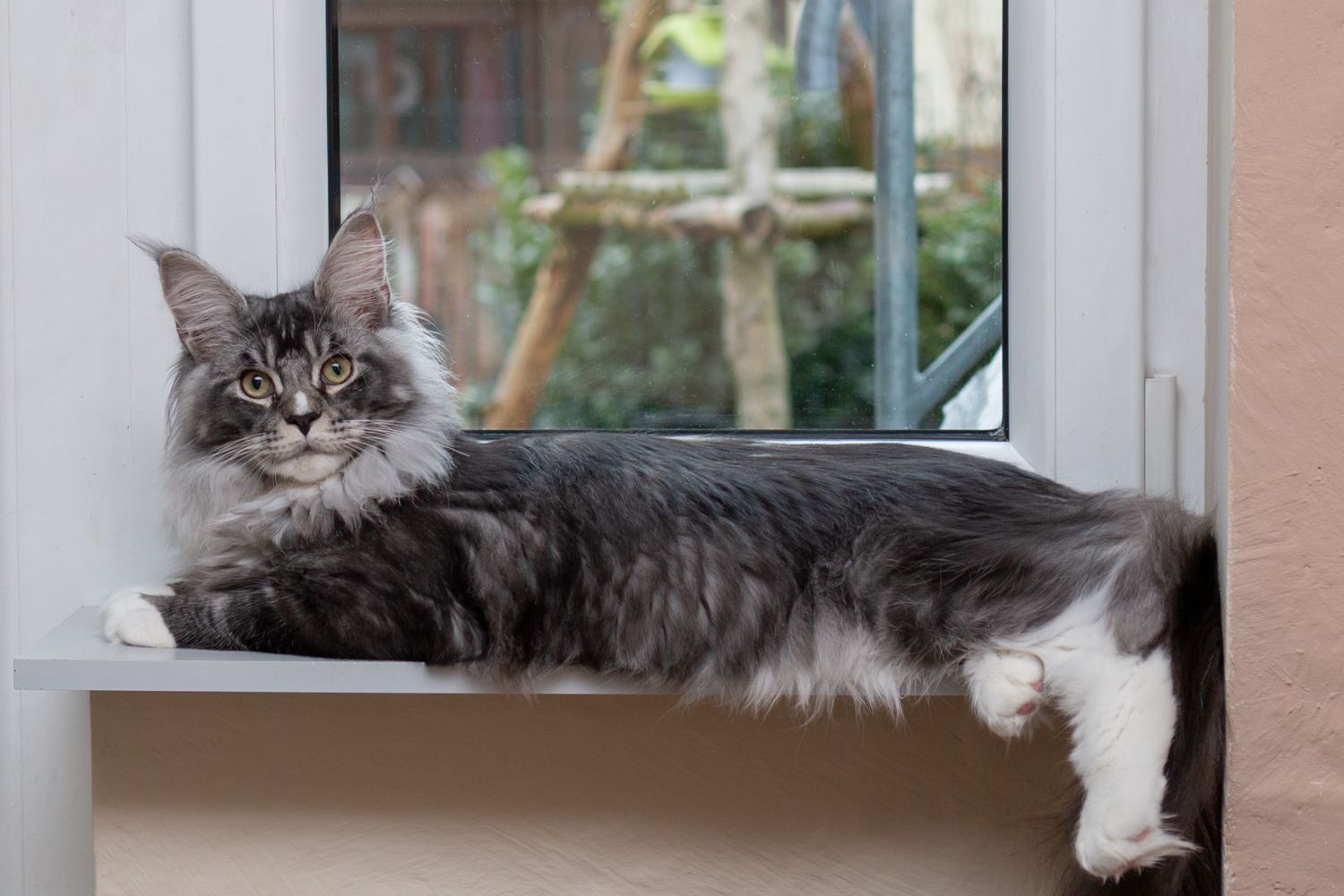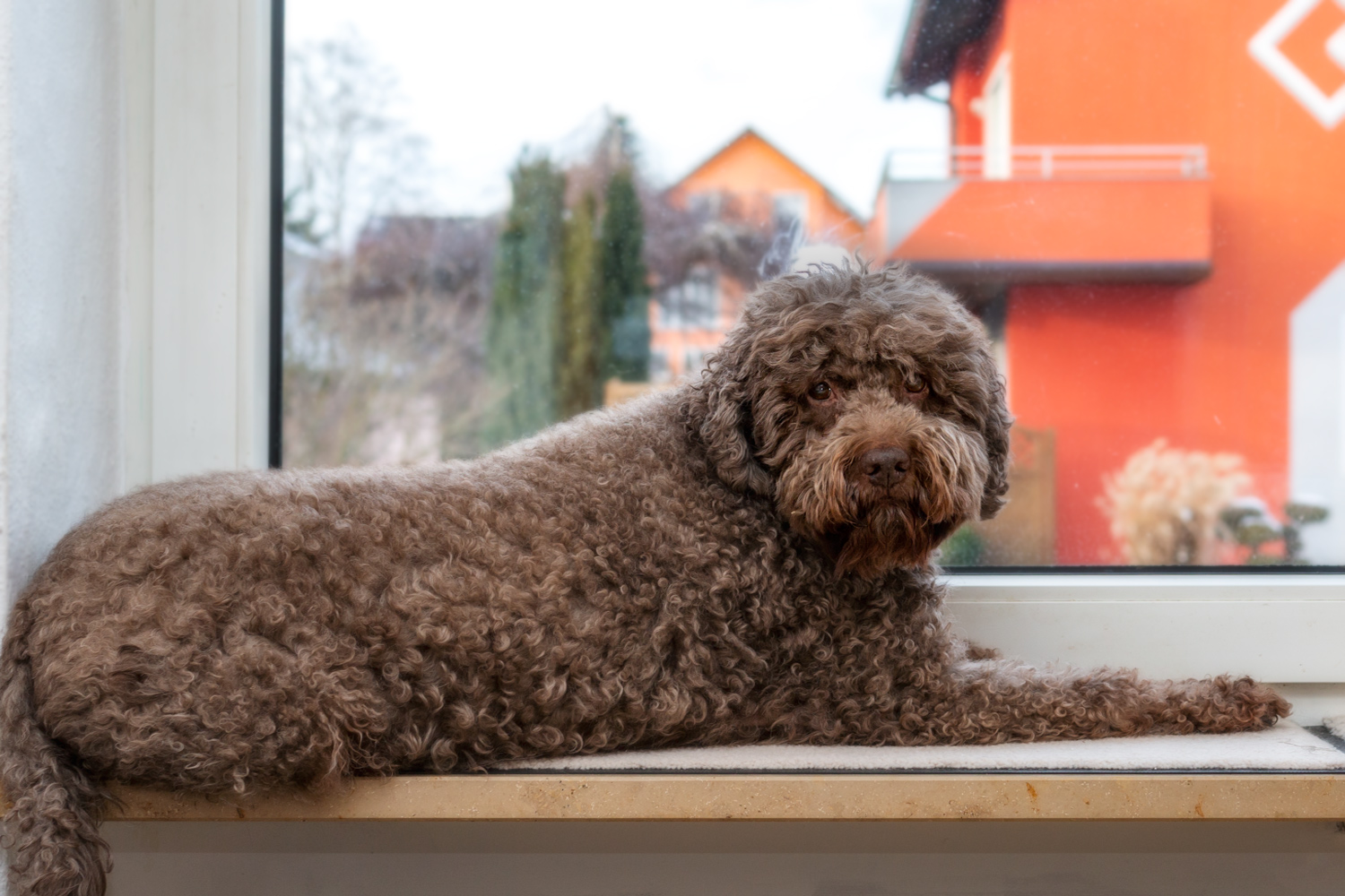 Zorro liegt auf der Fensterablage im Wohnzimmer.