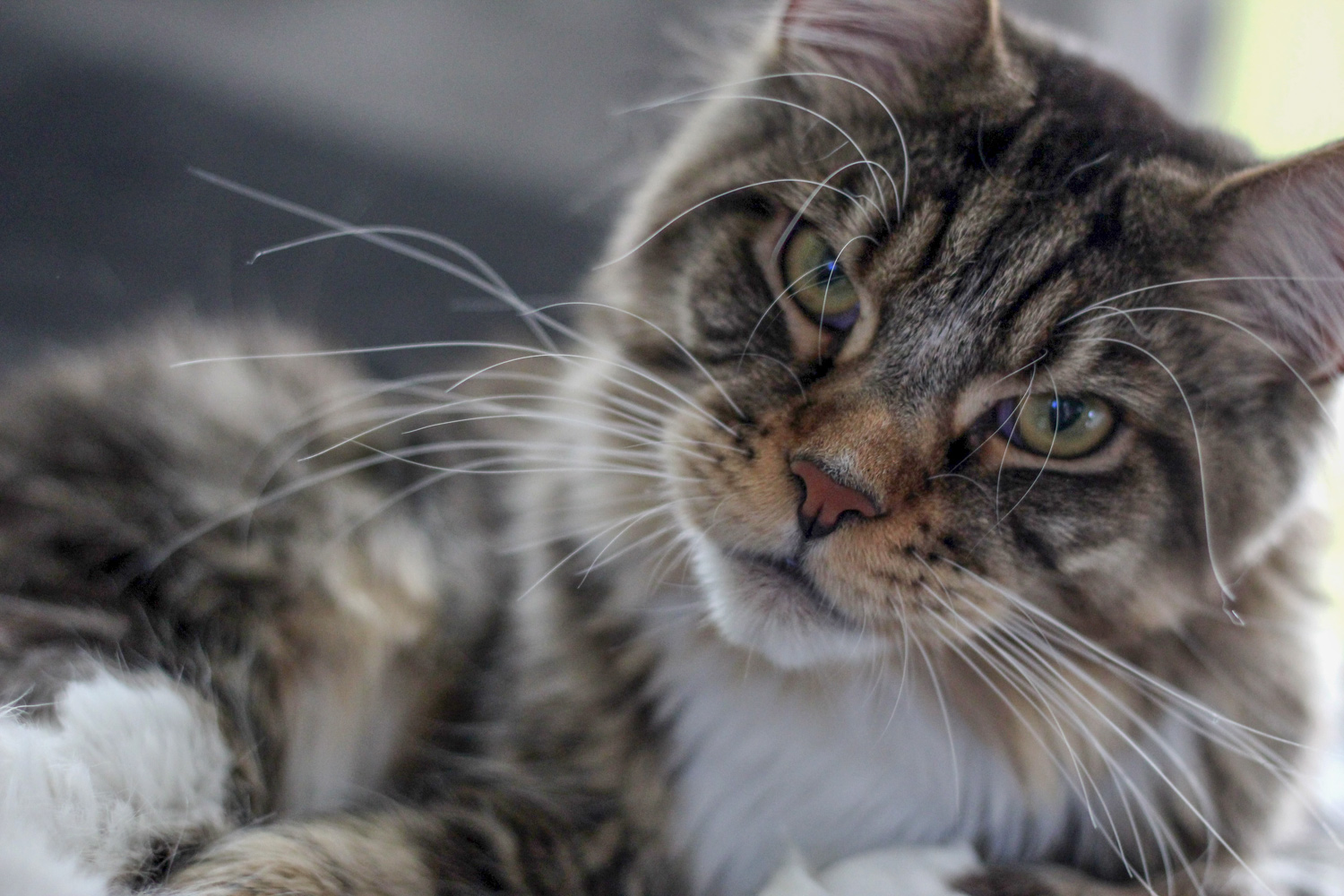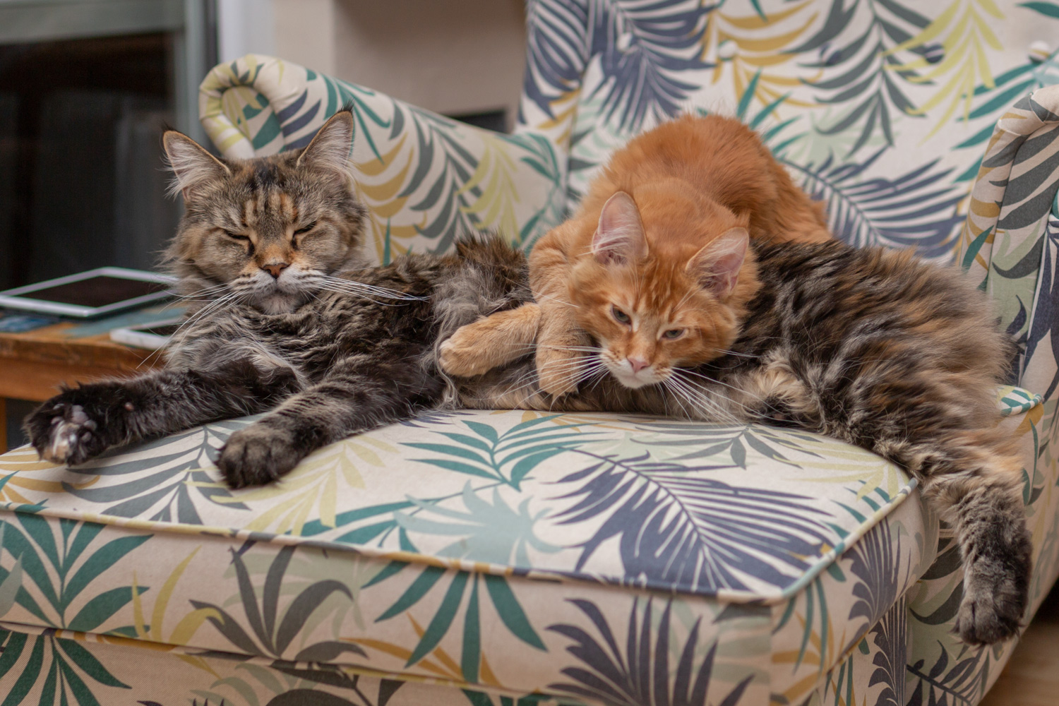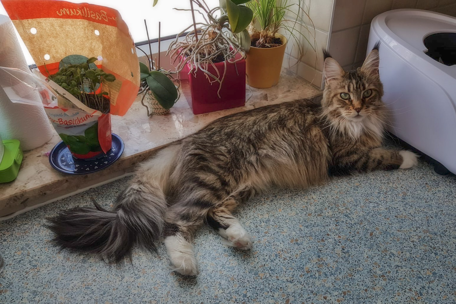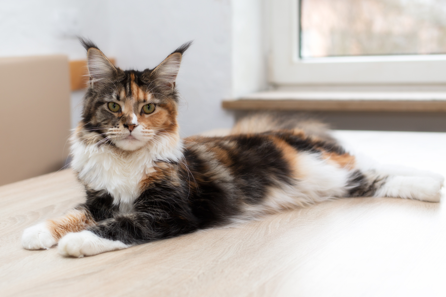 Zorro liegt auf der Fensterablage im Wohnzimmer.