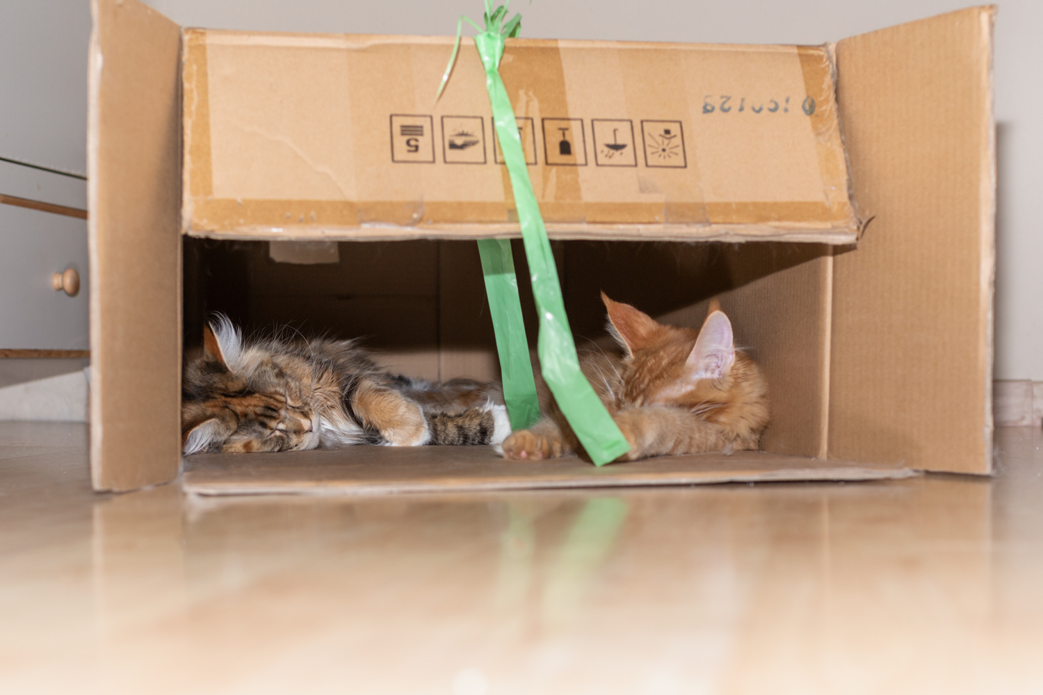 Eine neue große Schachtel wird von zwei Miezen als "