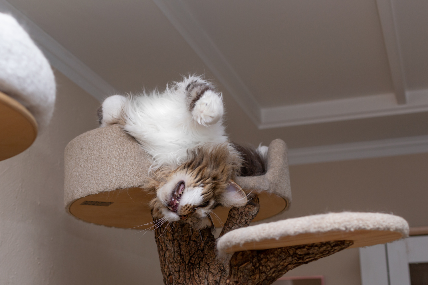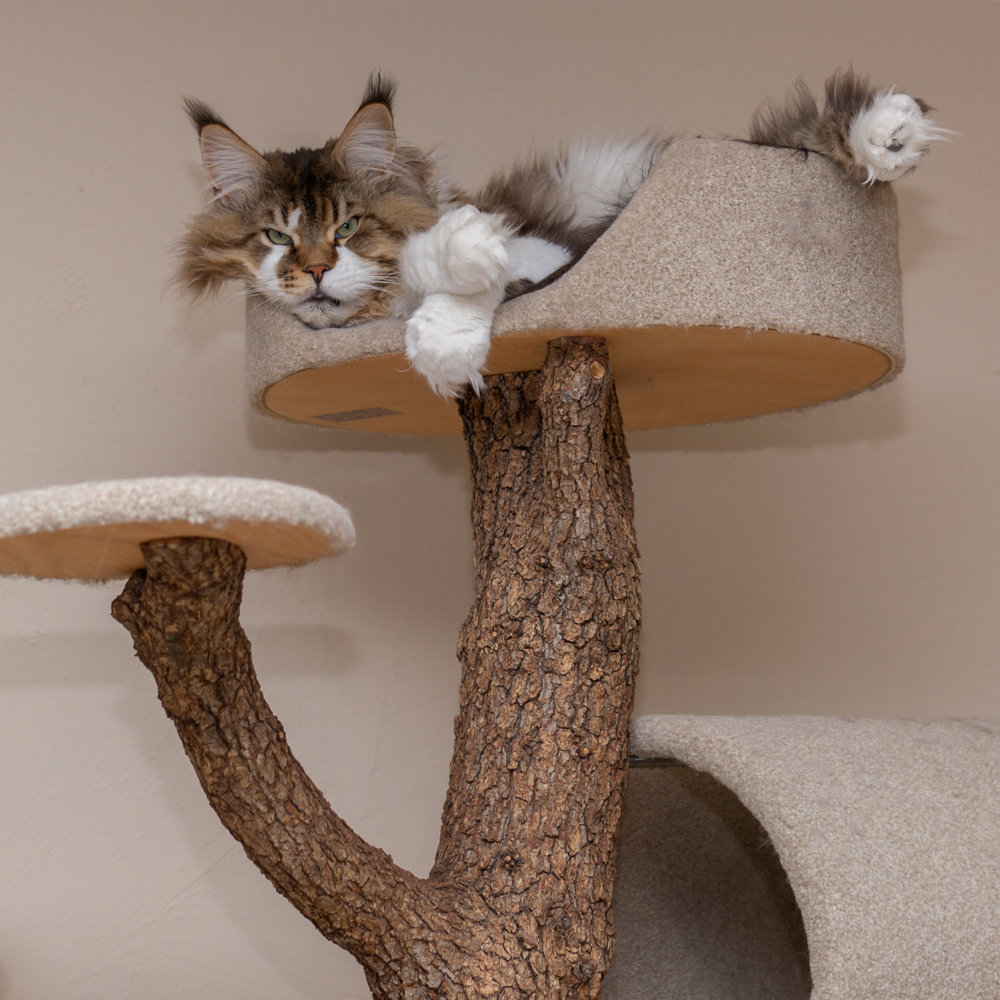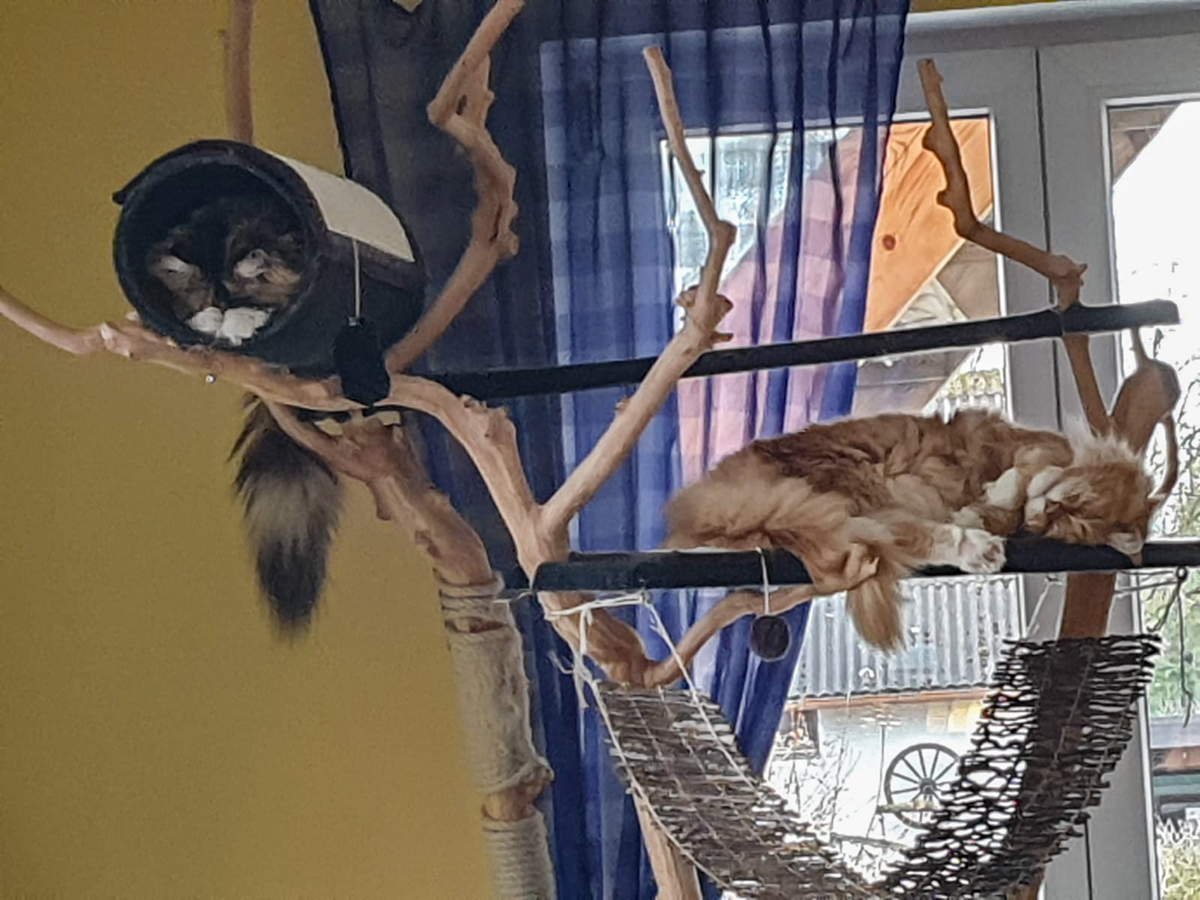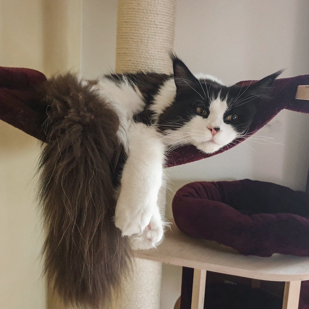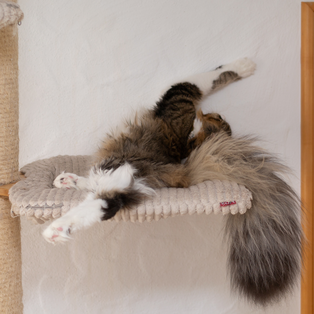 Woody verdreht sich beim Mittagsschlaf in der Kratzbaumliege.
