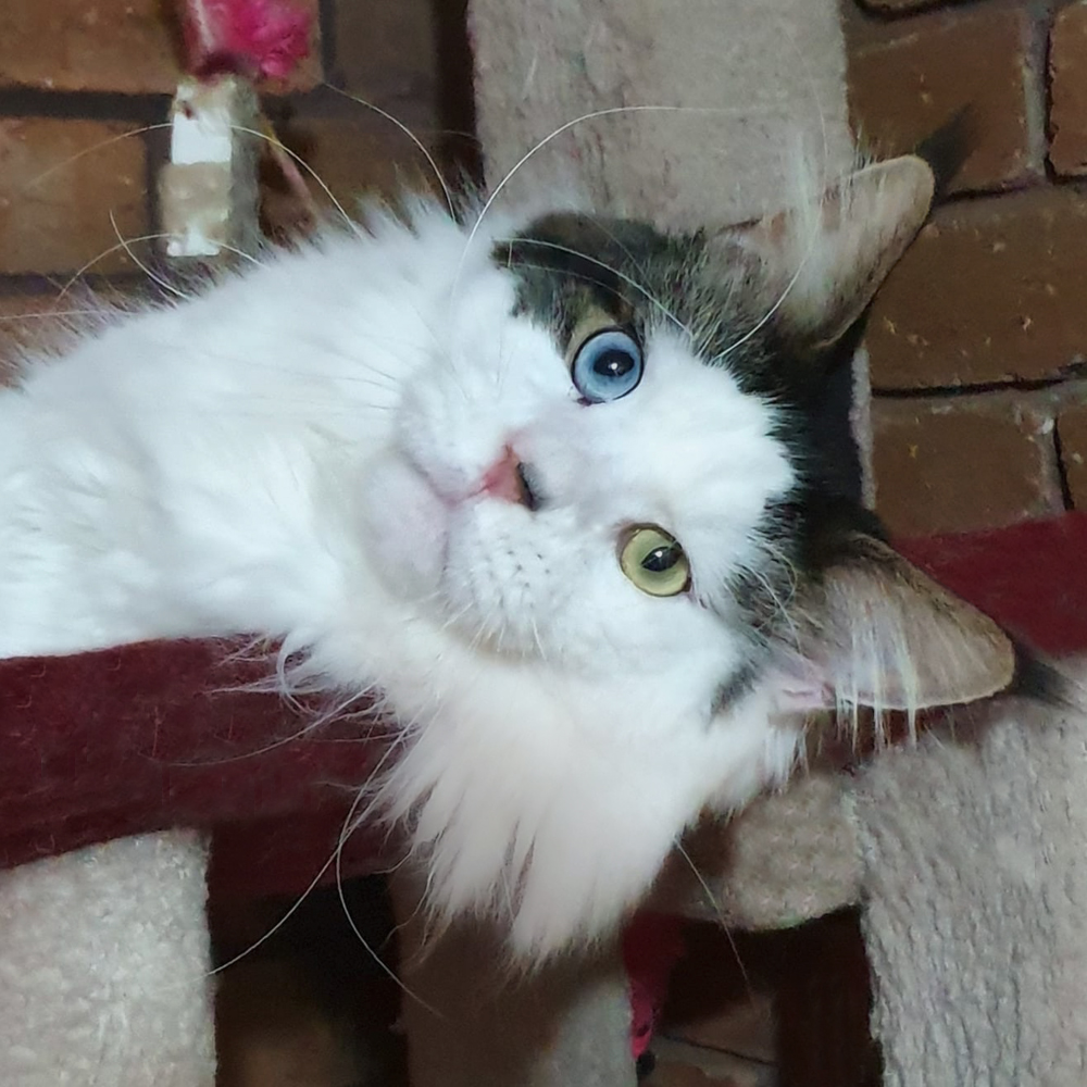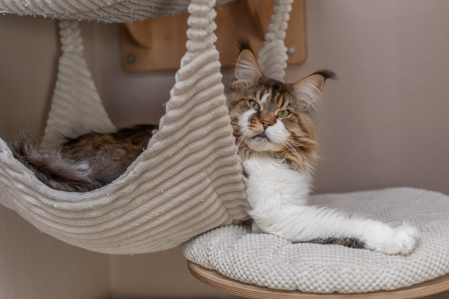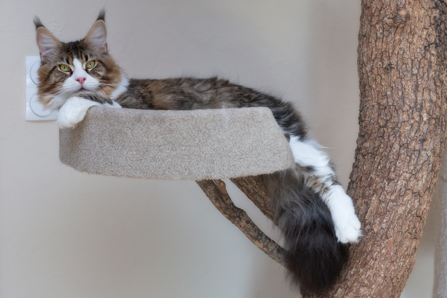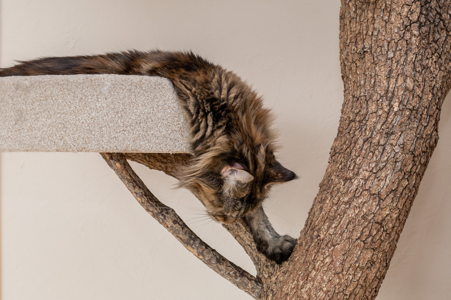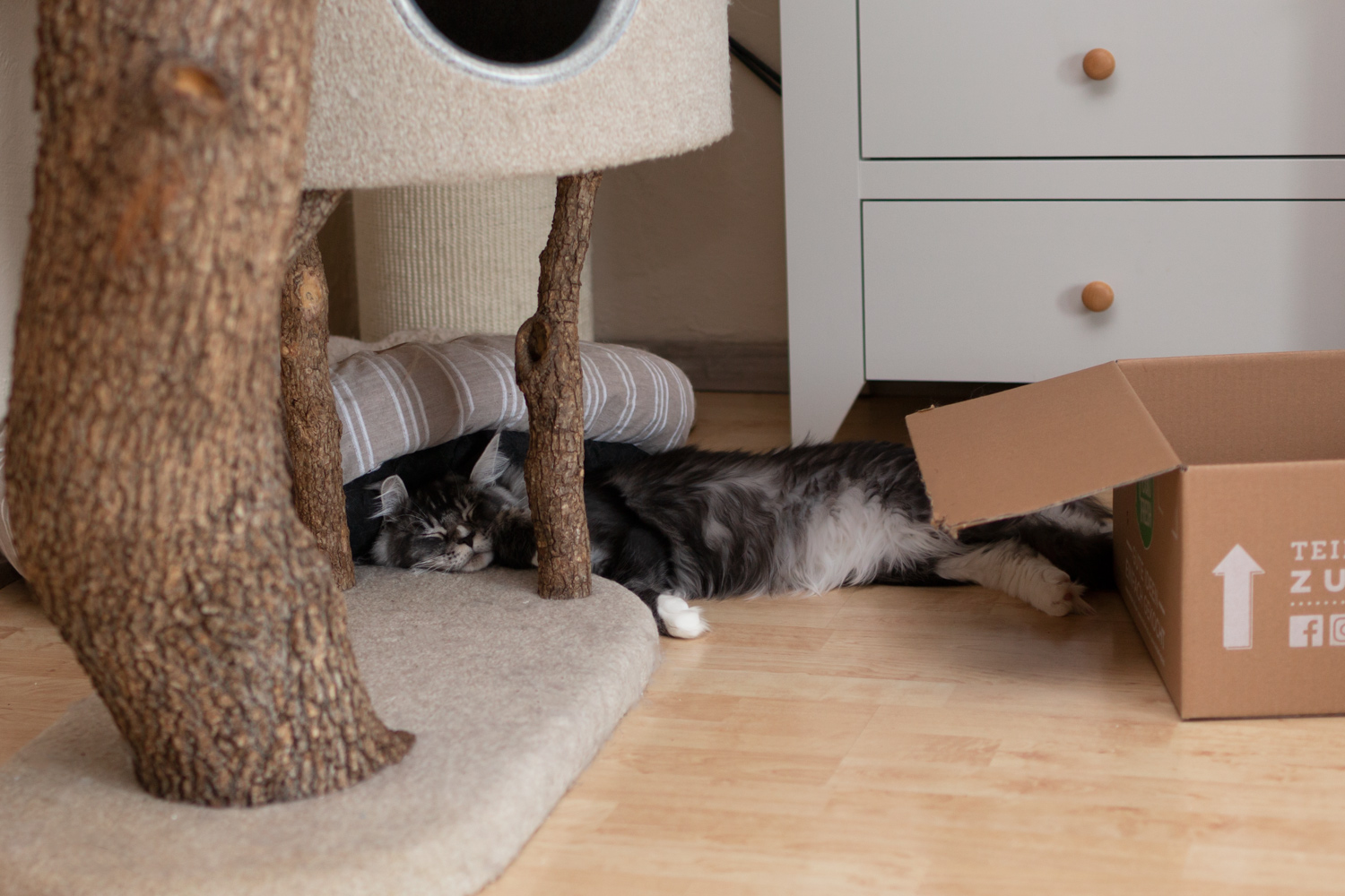 Woody verdreht sich beim Mittagsschlaf in der Kratzbaumliege.
