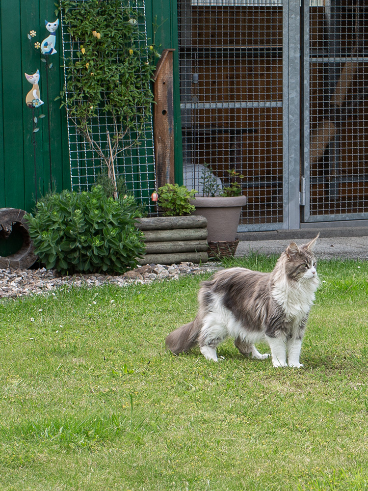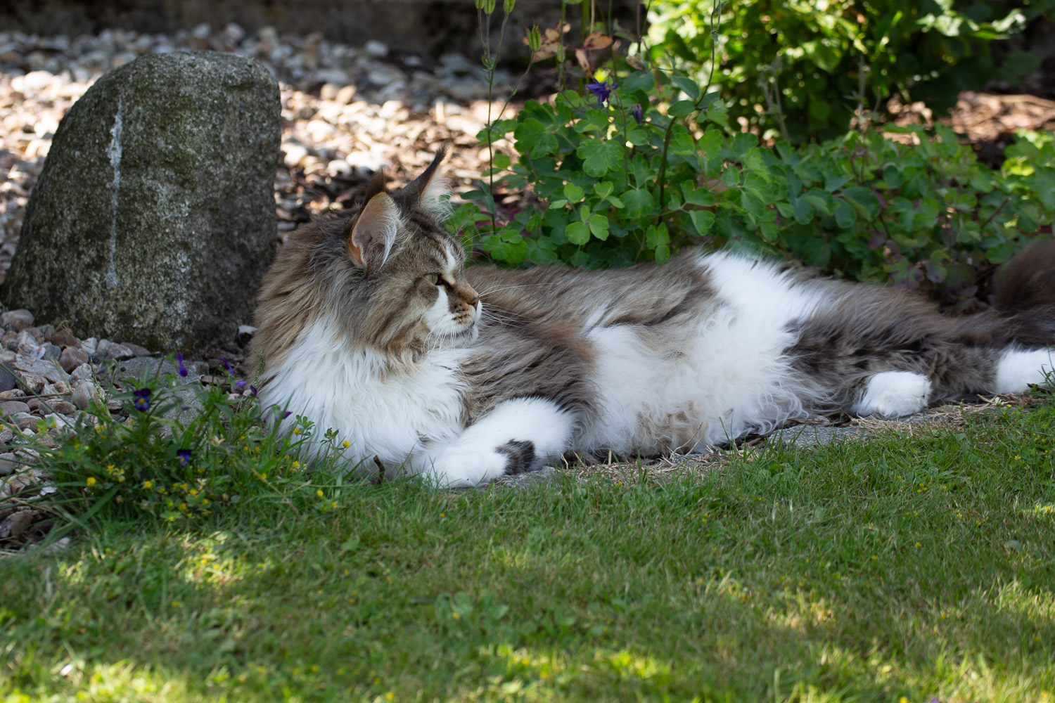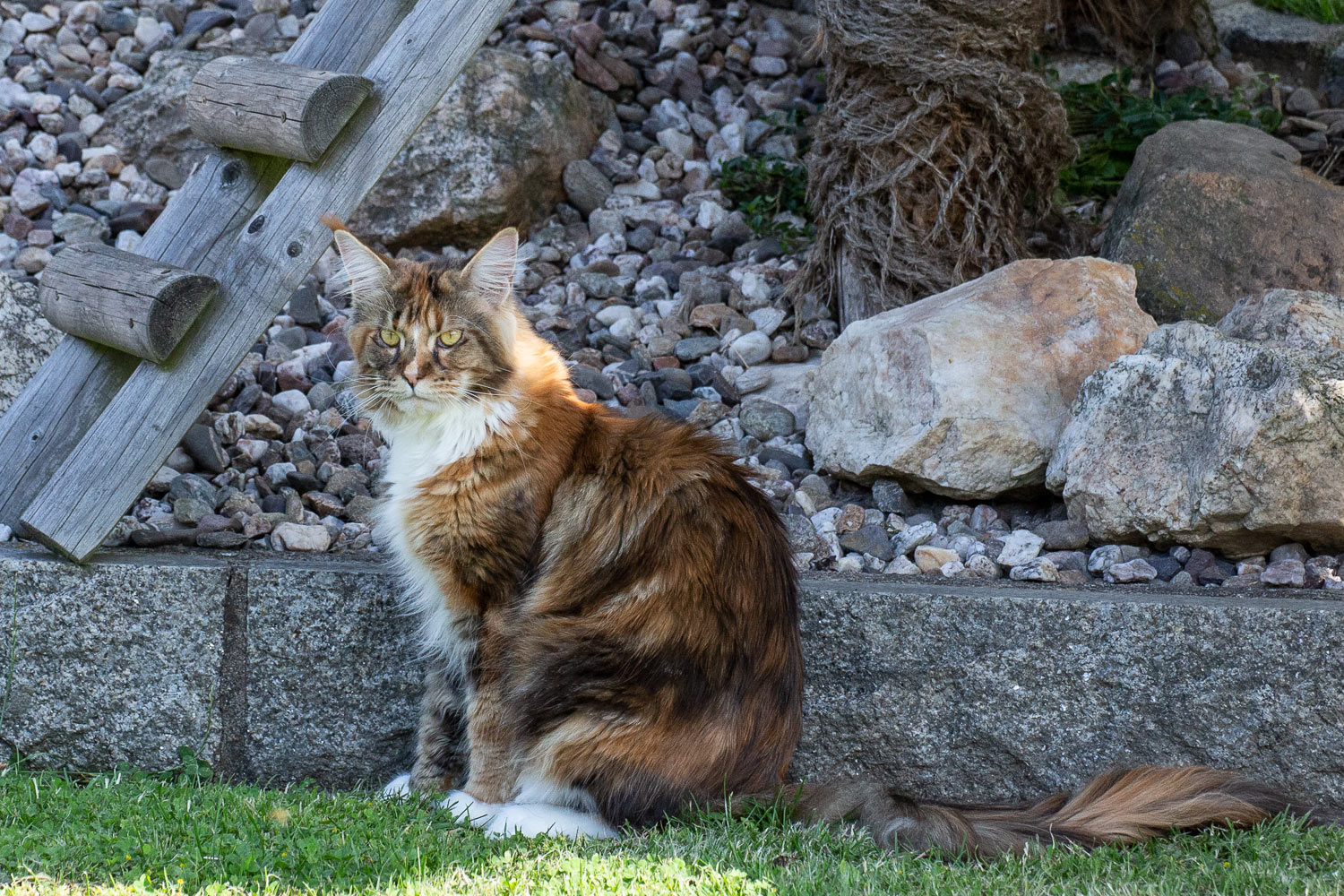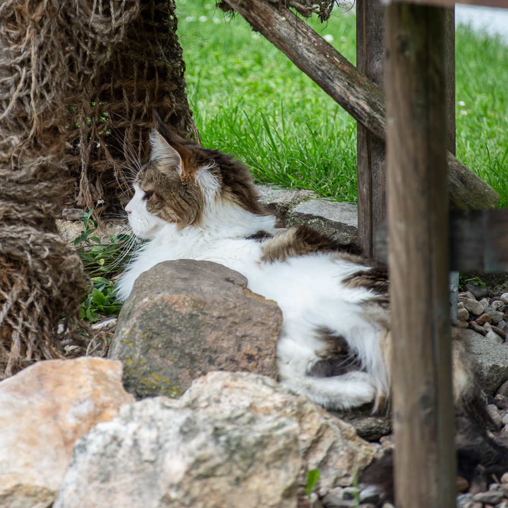 Rocky auf dem Kiesbett im Schatten des Außenkratzbaums - Bild1 und Bild2.