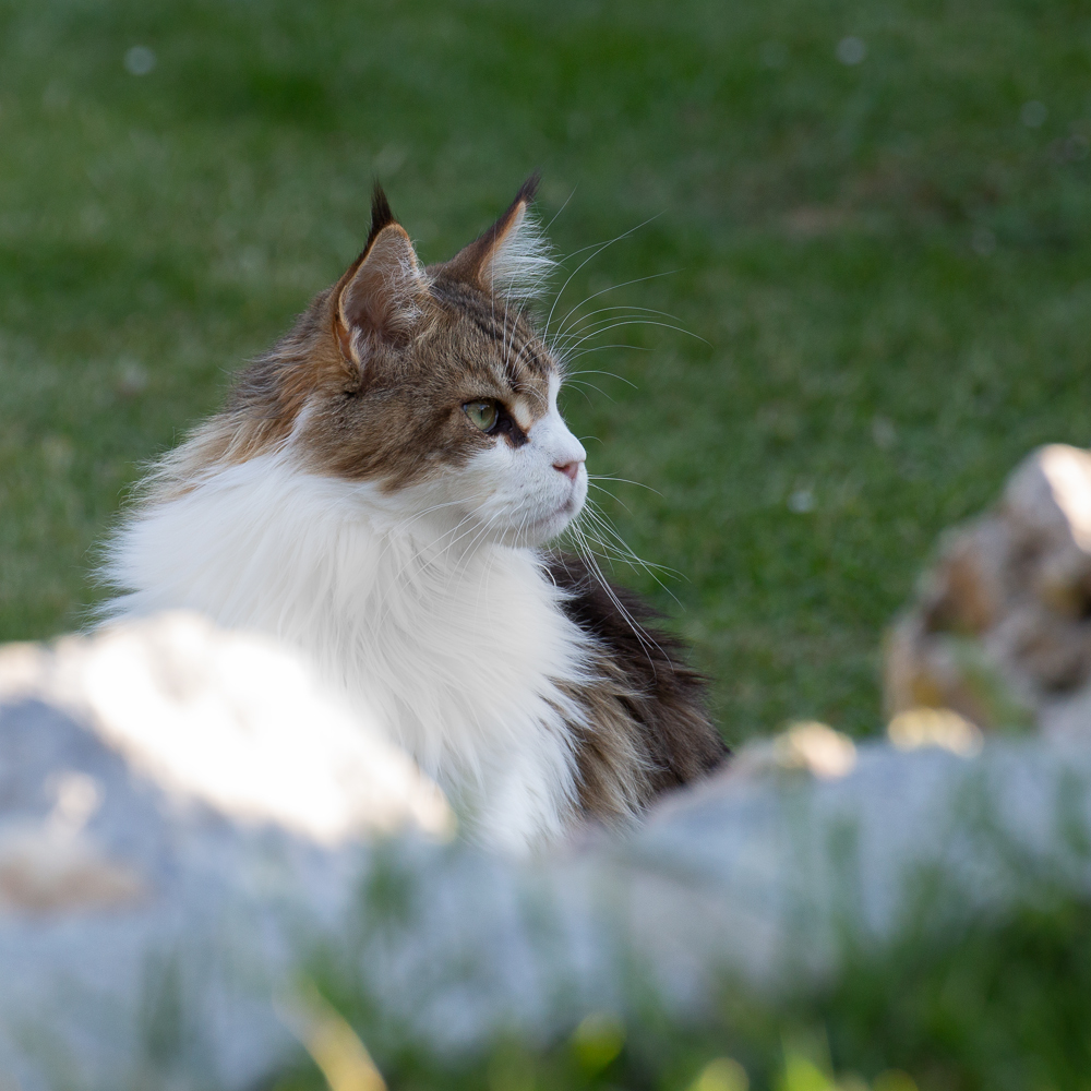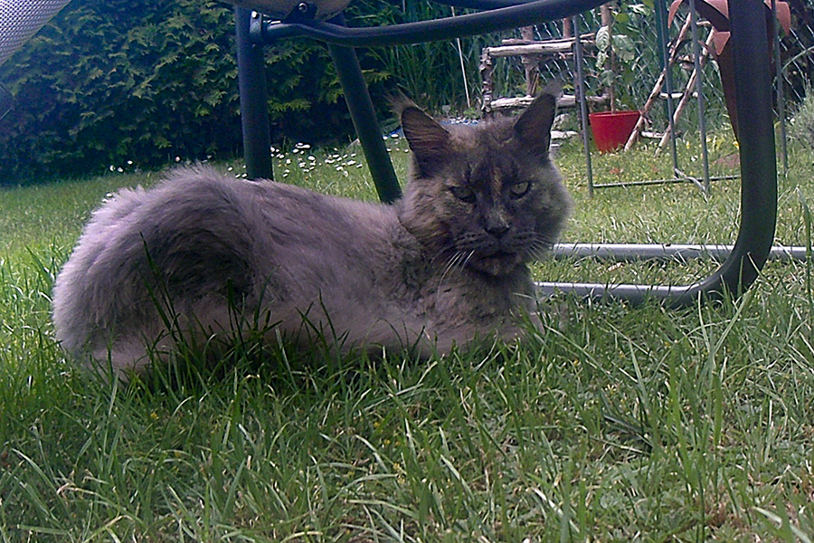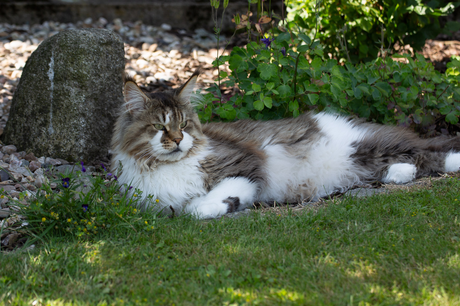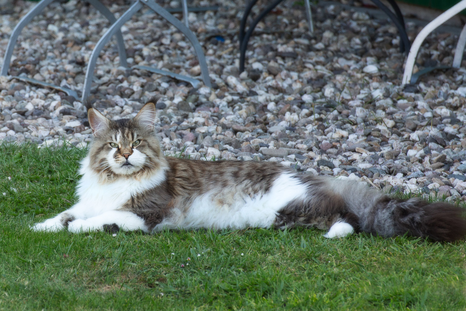 Rocky auf dem Kiesbett im Schatten des Außenkratzbaums - Bild1 und Bild2.