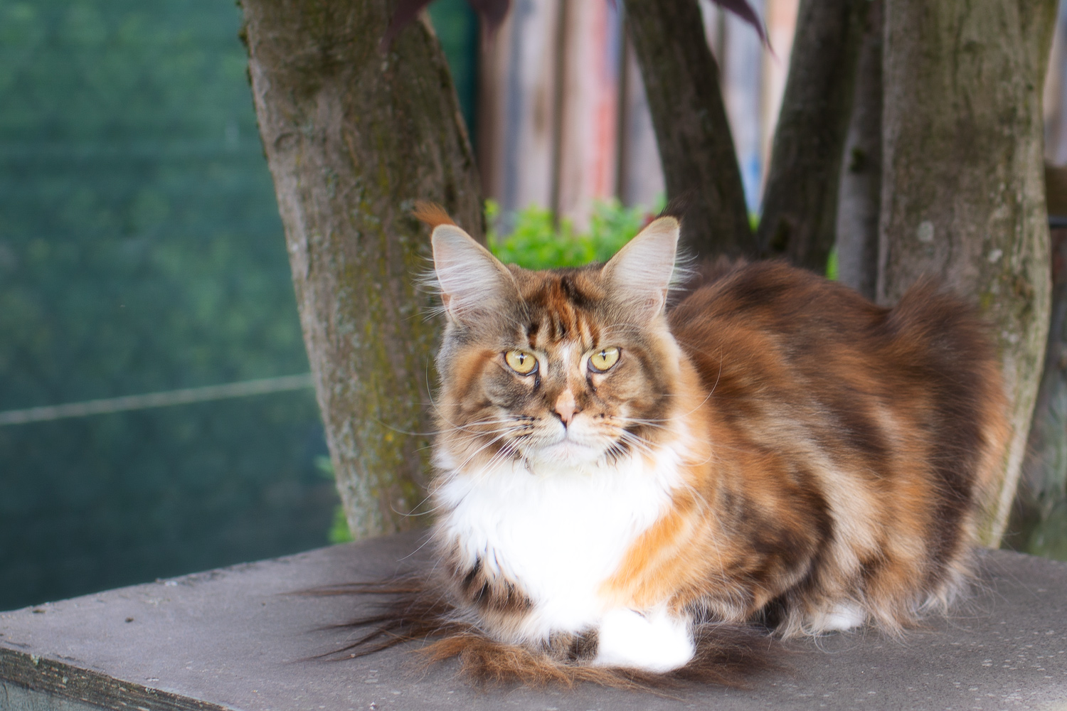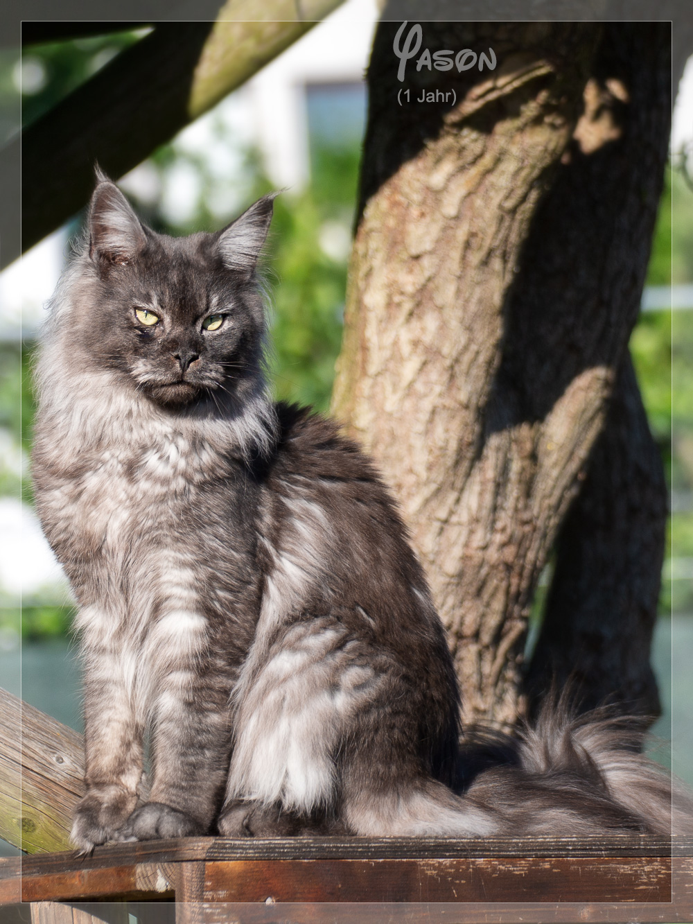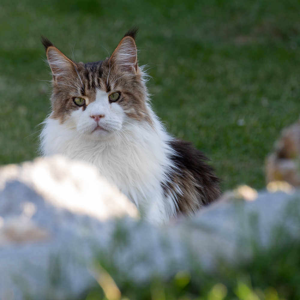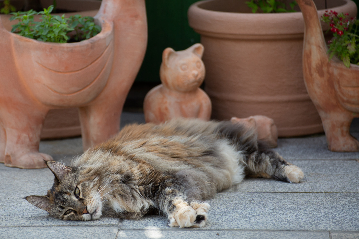 Rocky auf dem Kiesbett im Schatten des Außenkratzbaums - Bild1 und Bild2.