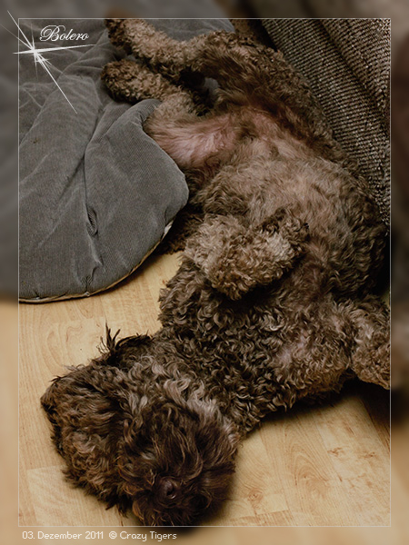 Diese Schlaf-Rückenlage hat er sich doch bestimmt abgeschaut. Katama hat "Großes" vor und versucht sich am Kauknochen von Bolero.