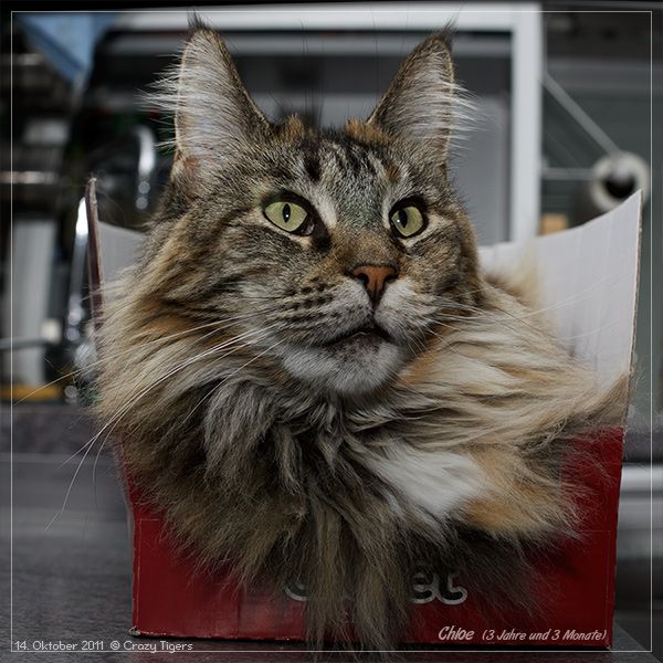 Chloe unsere Kastratin findet in der kleinsten Schachtel ein Plätzchen.