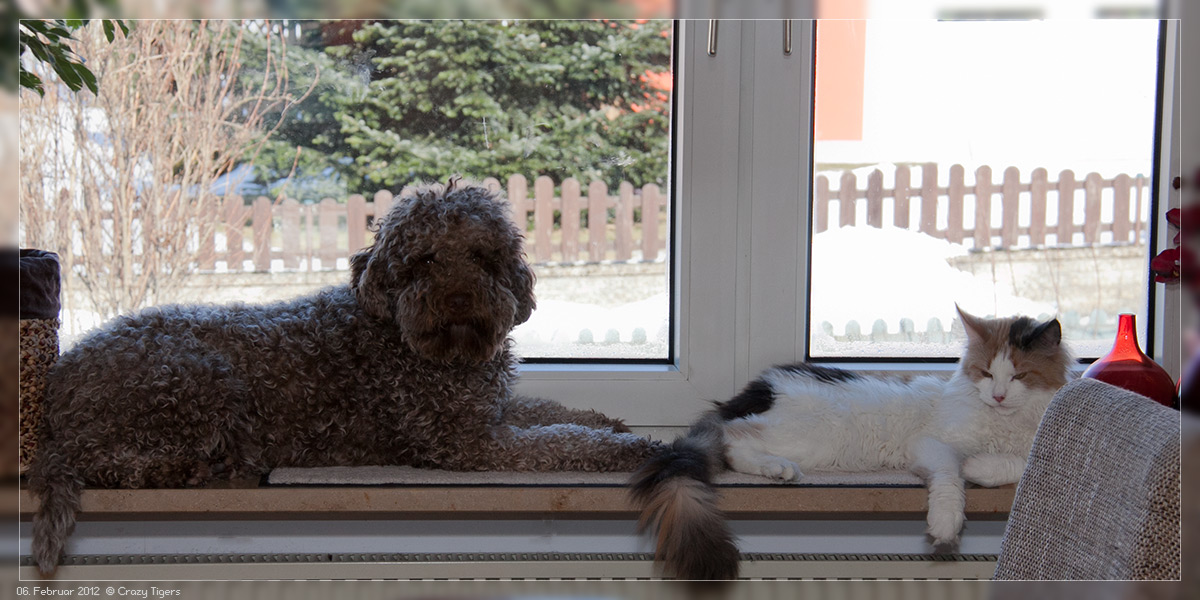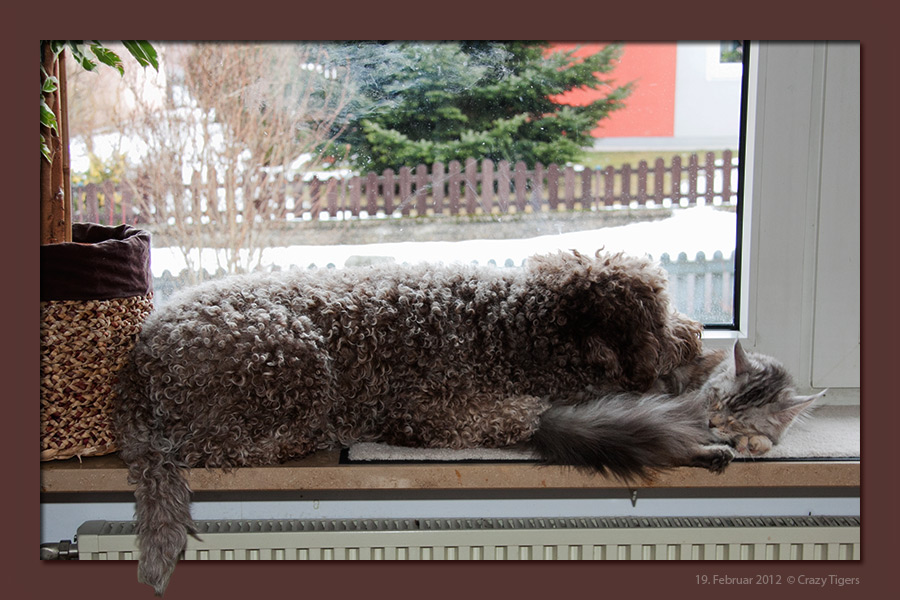 Pudelkatze entspannen sich auf der Fensterbank.