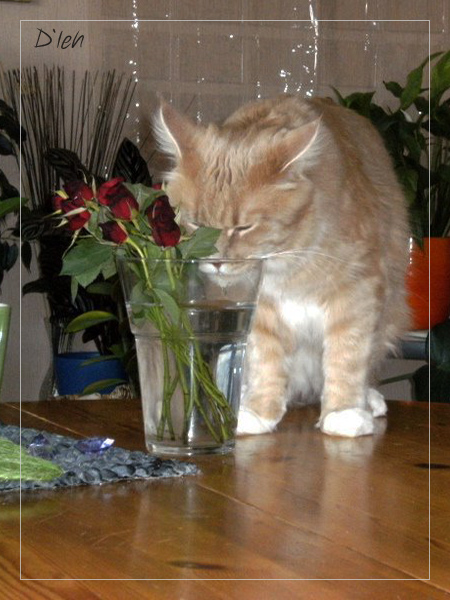 Dieses Foto von Annette zeigt uns, wie D'leh (DArtagnon) versucht aus der Blumenvase zu schlappern. Giaccomo ist müde und sehr gelangweilt - Danke Corinna.