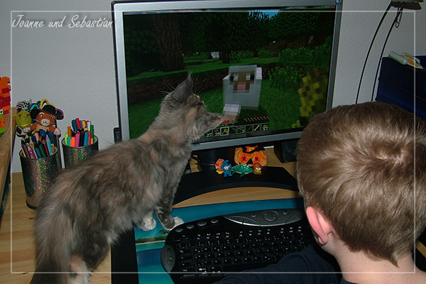 Zwei Fotos unserer Auswanderin Joanne - einmal als Bettbesetzer und einmal beim Computerspiel zusammen mit Sebastian.
