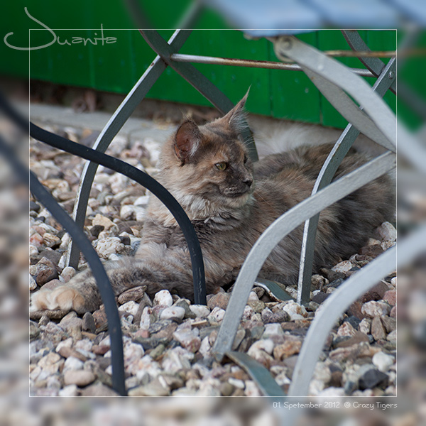 Juanita hat sich unter den Gartentisch zurückgezogen und ist hier im Steinkies sehr schlecht zu erkennen.